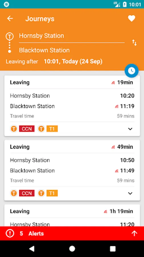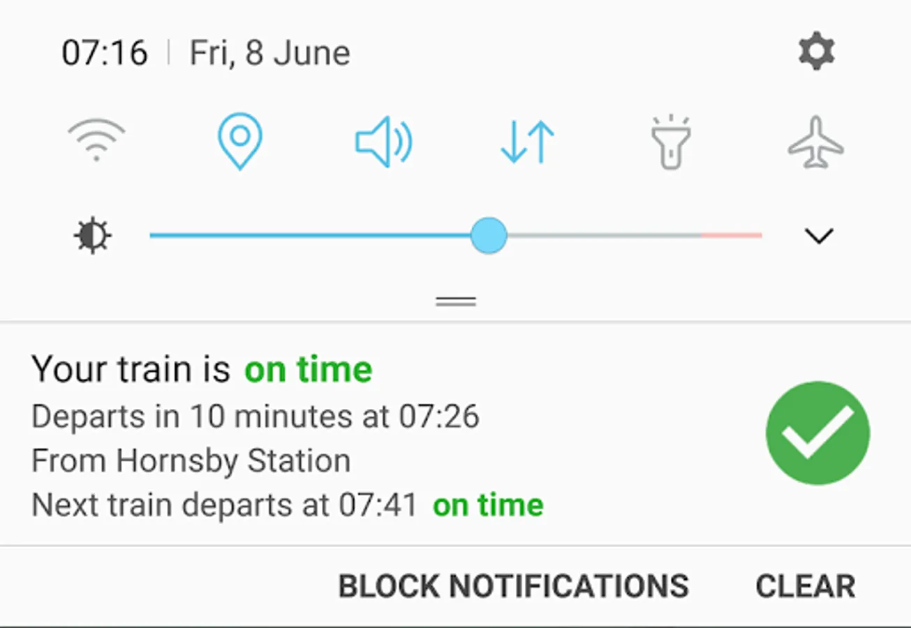 - Set an alarm and forget about your trip. The app will let you know if your trip is on-time or delayed or cancelled by sending a notification.