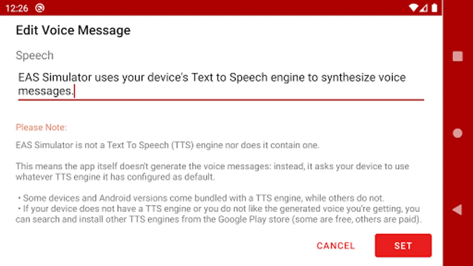 • Voice messages are not generated by EAS Simulator. Instead, the app uses your phone/tablet's built-in Text to Speech engine, if it has any. If your device doesn't have a TTS engine installed, the voice messages will not play, but everything else in the alerts will. The Google Play store has plenty of TTS engines and voices (both free and paid) you can use. If you want to use different voices in your alerts, you need to download and install a different TTS engine on your device and set it as the default.