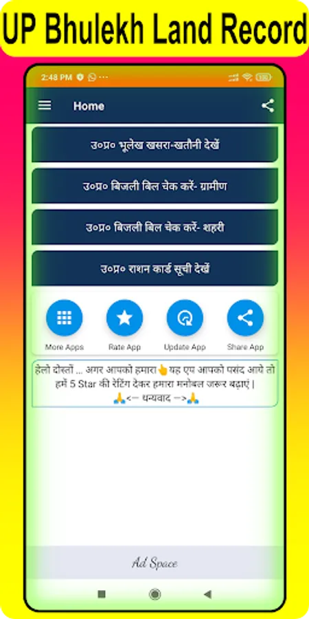 इस एप के द्वारा आप अपने मोबाइल से घर बैठे (उ०प्र० भूलेख खसरा-खतौनी , उ०प्र० राशन कार्ड सूची 2023, उ०प्र० बिजली बिल -ग्रामीण/शहरी ) चेक कर सकते हैं |