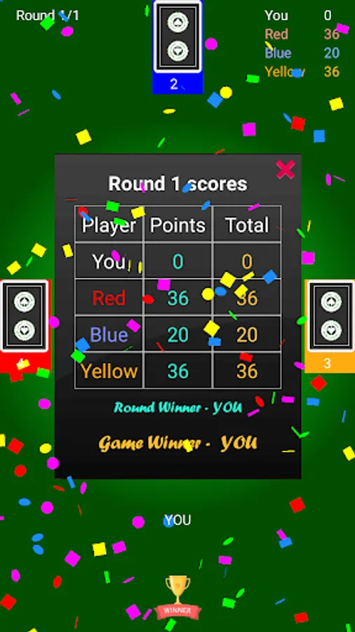 After the last round winner/winners will be declared based on total number of points of all the rounds . The player with MINIMUM number of total points wins the game.