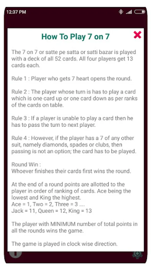 Card Games are very exciting source of entertainment and fun. 7 on 7 / satte pe satta / seven / satti bazar is a strategic card game played with a deck of 52 cards without joker. All four players get 13 cards each.