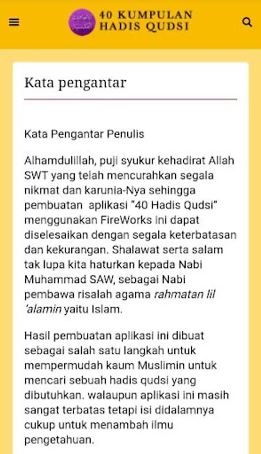 Alhamdulillah, thank God the presence of Allah SWT who has poured all his favors and gifts so that the making of the application "40 Hadith Qudsi" using FireWorks can be resolved with all the limitations and shortcomings. Our blessings and greetings do not forget to offer the Prophet Muhammad (peace be upon him) as the bearer of the treatise of the rahmatan lil 'alamin religion, namely Islam.