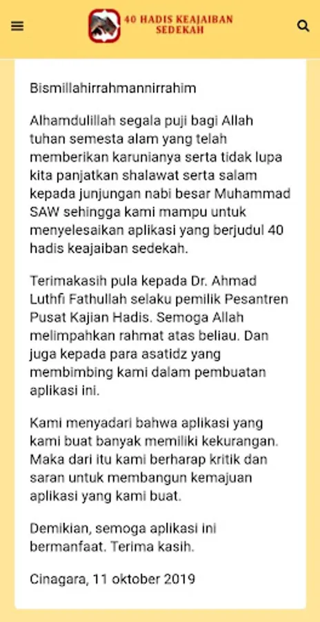 Alhamdulillah, all praise be to Allah, the God of the universe who gave his gifts and did not forget our prayers and greetings to the great prophet Muhammad SAW's lord so that we were able to complete the application titled 40 hadith miracles of alms.