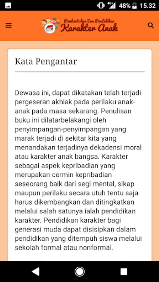 Dewasa ini, dapat dikatakan telah terjadi pergeseran akhlak pada perilaku anak-anak pada masa sekarang. Penulisan buku ini dilatarbelakangi oleh penyimpangan-penyimpangan yang marak terjadi di sekitar kita yang menandakan terjadinya dekadensi moral atau karakter anak bangsa. Karakter sebagai aspek kepribadian yang merupakan cermin kepribadian seseorang baik dari segi mental, sikap maupun perilaku secara utuh tentu saja harus dikembangkan dan ditingkatkan melalui salah satunya ialah pendidikan karakter. Pendidikan karakter bagi generasi muda dapat disisipkan dalam pendidikan yang ditempuh siswa melalui sekolah formal atau nonformal.