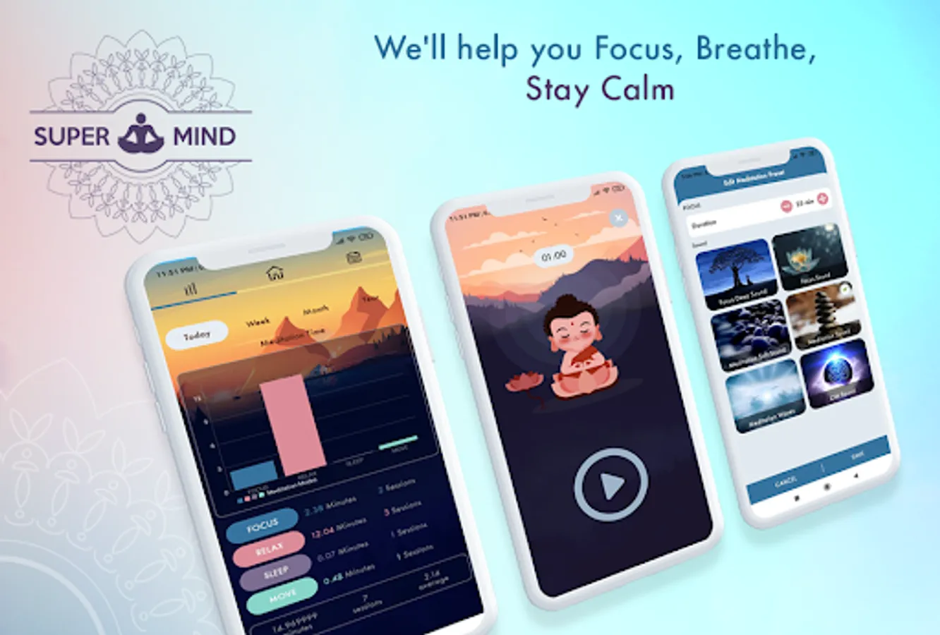 We offer different music for different modes and sessions based on your selection. There are 4 modes in the application FOCUS, RELAX, SLEEP and MOVE for relaxing your mind and body. You can adjust the length of each session (in minutes) based on your own time and availability. Chart with detailed description is available for tracking the progress. If you want to track your meditation details for different dates then a separate calendar has been provided where you can select a date to see your meditation sessions for that date.