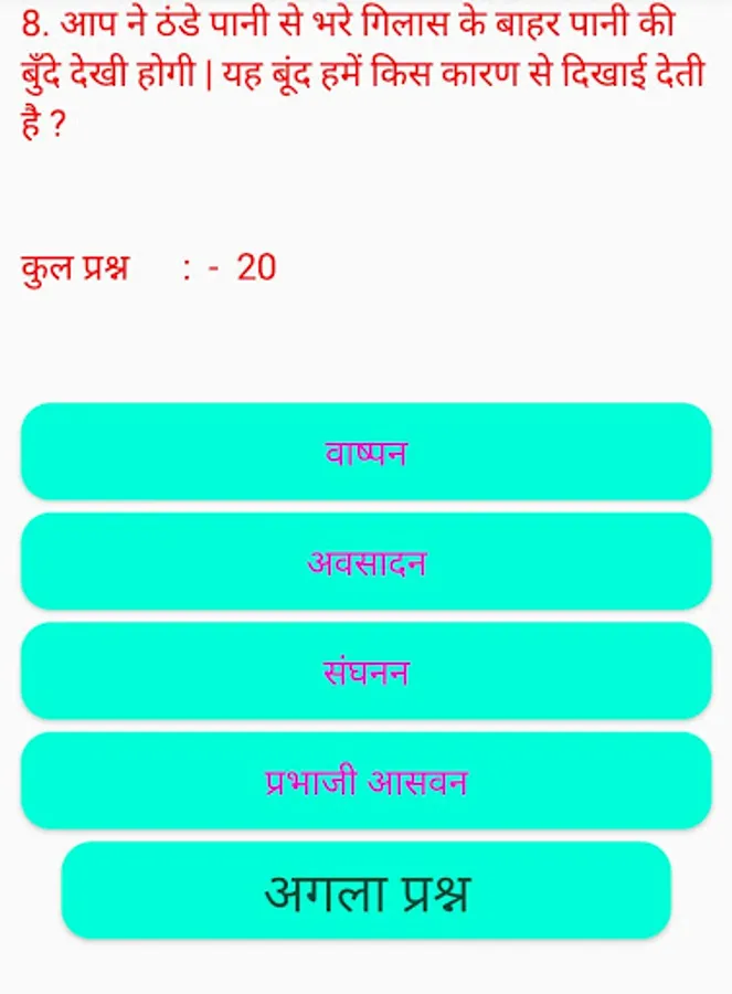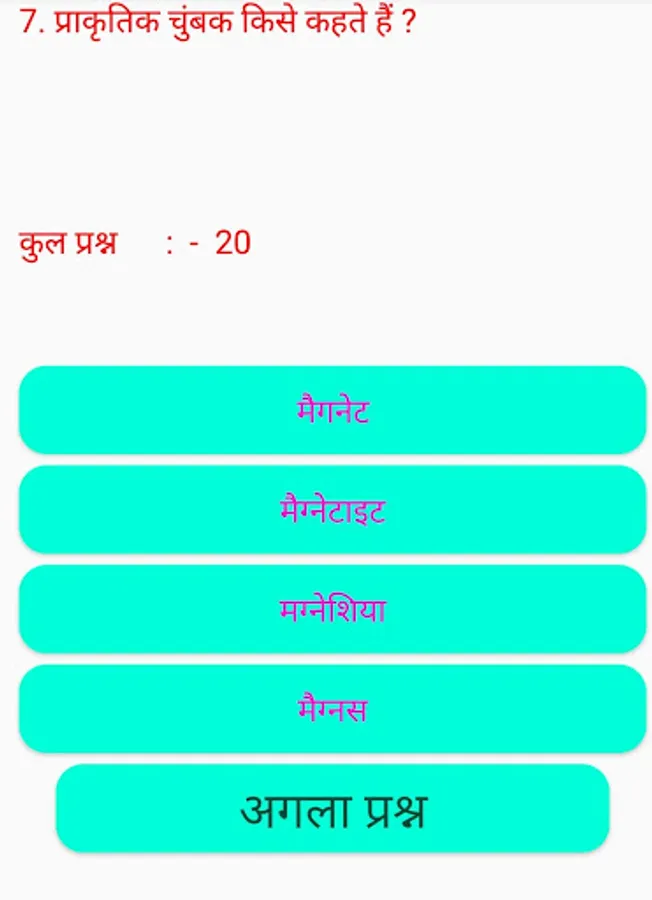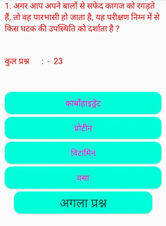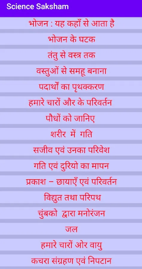 This application has class 6th Science multiple choice question. All questions are taken from text book of haryana board of school education. This application is very useful for student in saksham programm run by haryana board. Answers are not shown in this application. This is plus point because if answers are given students will start cramming. Students will try to solve the questions from their text book.