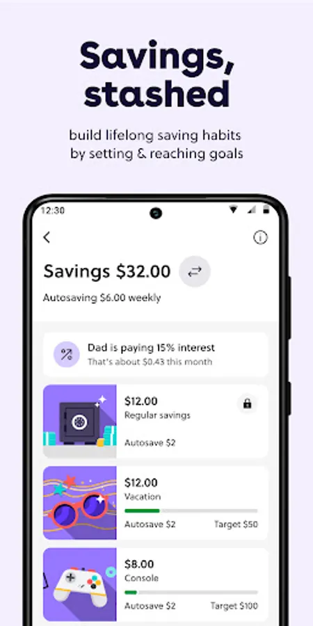 Young people can customize savings goals and set up an auto-save amount. Parents can reward saving habits by setting parent-paid interest in-app—and keep goals on track by locking them.
