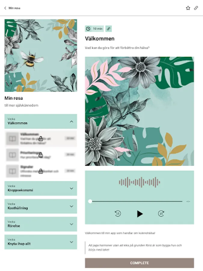 En app om kvinnohälsa. Den är för dig som vill få förståelse, självkännedom och kunskap om din kropp så att du kan må så bra som möjligt. Information blandas med övningar så att du får rätt fokusområden.
