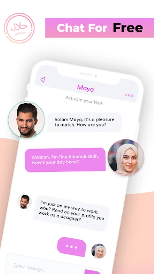 An optional bridal like digital veil covers every profile photo by default and unveils when there's a match. You choose your nickname if you prefer to be anonymous on search results. All users have the option of adding our Wali guardian feature to all their chats.