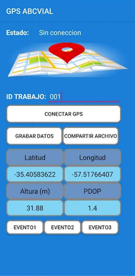 Route Log, just enter the job name or ID, tap the "Connect GPS" button and then "Record data" to start storing GPS points every 1 second, you can store event location with buttons at the bottom. Use "Share File" button to send generated files to other devices.
