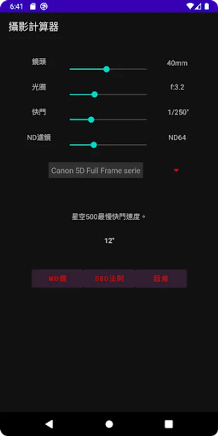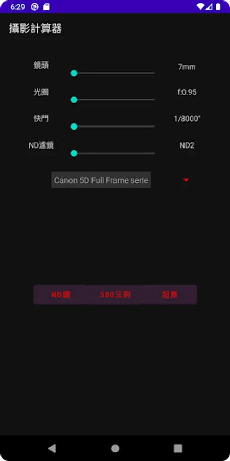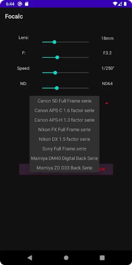Enter the lens, aperture, shutter speed and ND filter parameters with scroll bars,