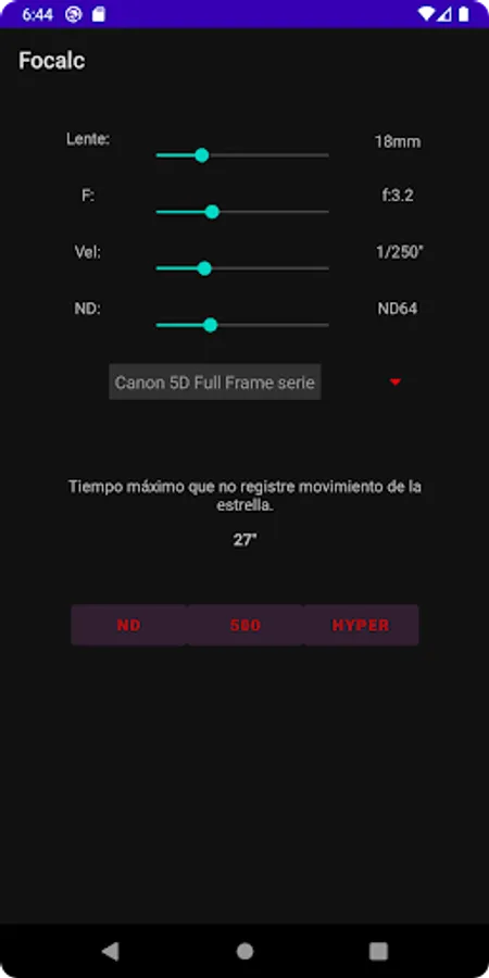 Focalc is an assistant to calculate the time with ND filter, rule of 500 and hyperfocal calculation.