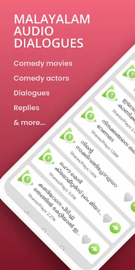 It contains trending malayalam punch and comedy audio dialogues from famous malayalam movies and web series which adds more fun to your chat. It has large collection of dialogues that can be directly shared in your whatsapp chat and which makes smile or laugh in the other person.
