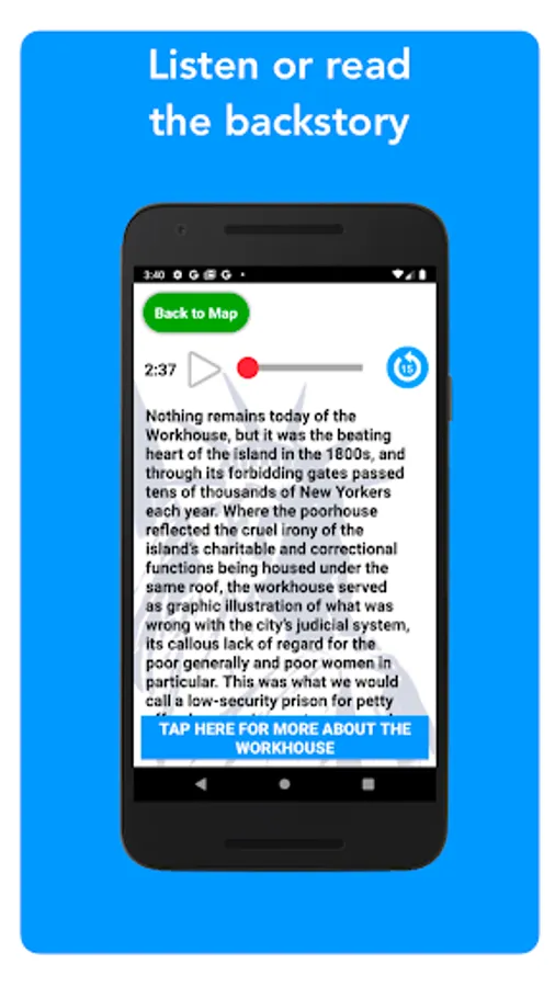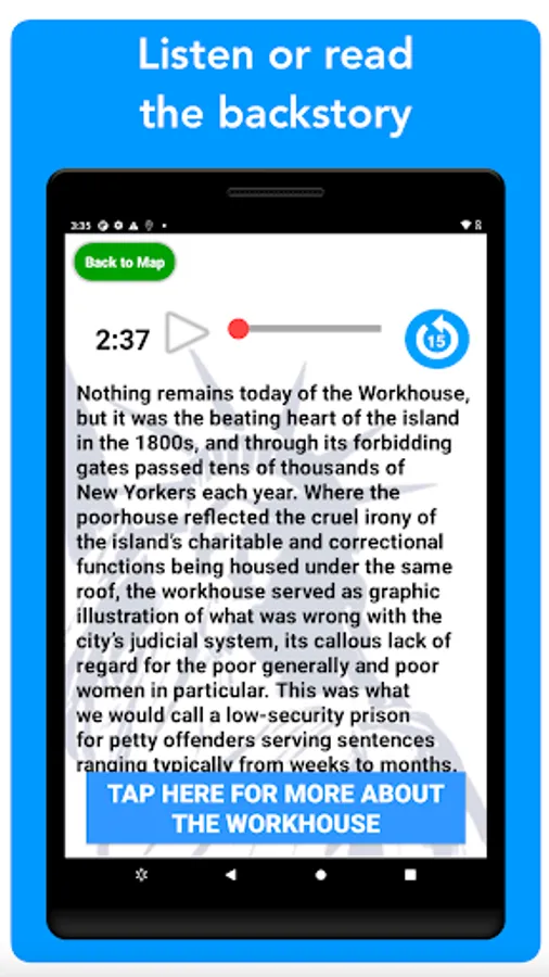 To obtain real-time walking directions from your location to any of the Places on the tour or anywhere else on the island, your device’s Location Services/connectivity must be turned on. If you don’t need directions, no internet connectivity is required to enjoy all of the app’s rich content. Once purchased, the tour is yours. You can use it as often as you like and share the experience with friends and family whenever you choose.