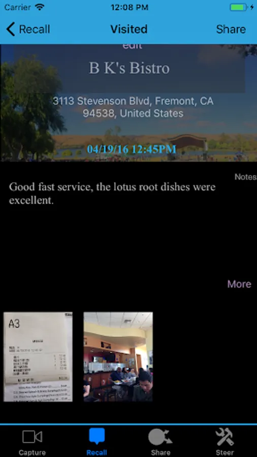 You can share any of your experiences with friends, and on social media; also you can receive recommendations from your friends. At the capture session, the app provides Yelp scores and recommendations from your friends.