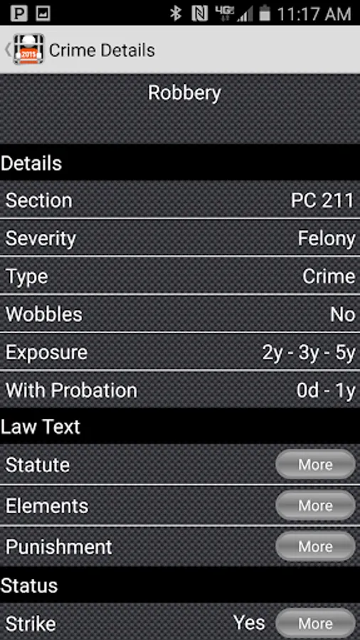A crime finder application from the makers of CrimeTime. Designed for legal practitioners by legal practitioners actively working in the field. This is a quick reference tool for looking up most of the California criminal statutes. This version is up to date with the latest changes in law for 2023. There is also a Custody Credit Calculator, Release Date Calculator, and Court Date Calculator. The Court Date Calculator helps make tracking court days vs. calendar days quick and efficient.