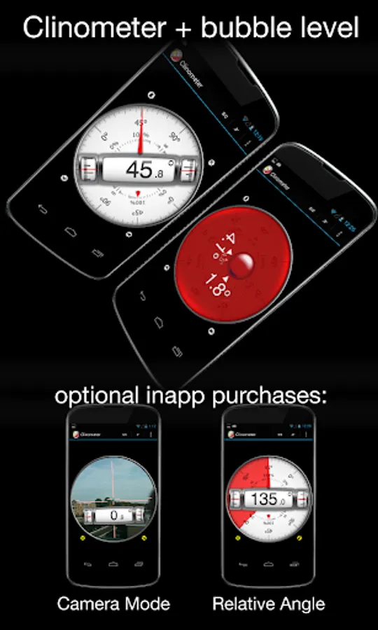 ✔ Two optional features as in app purchases: Camera mode and Relative Angle