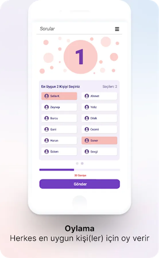 Participants are asked a question from which they must choose one of the group. (ex: Who is the funniest among us?)
