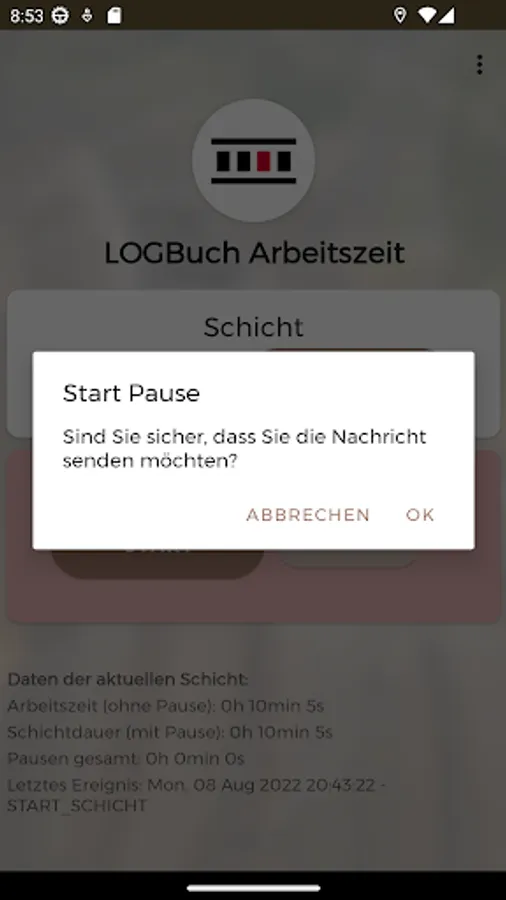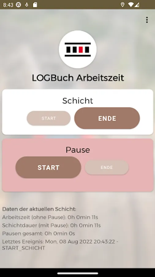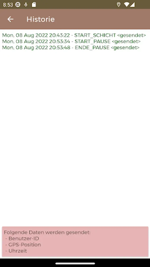 The user has the possibility to check his current working and break times at any time. There is also the possibility to view the history of the last 30 days.