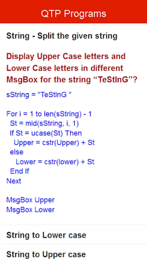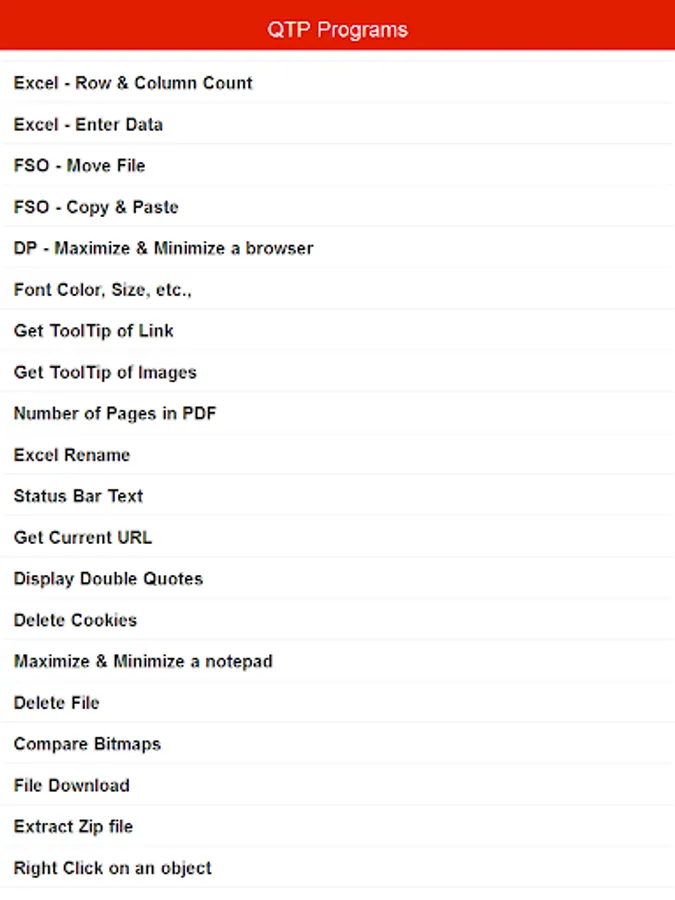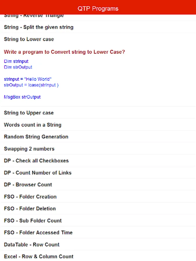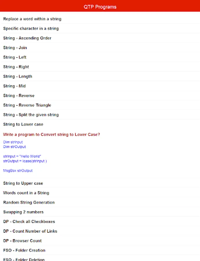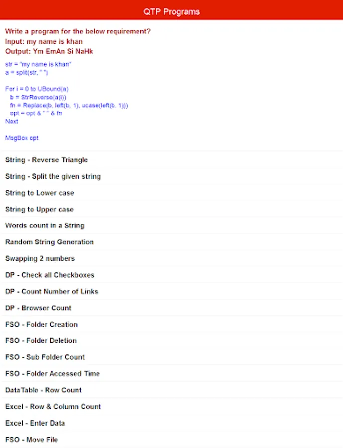 Brings you the collection of QTP & VBScript Programs packed into the app, which are very useful for anyone who wants to prepare for the interview and to learn QTP Programming. And you can prepare on the go.