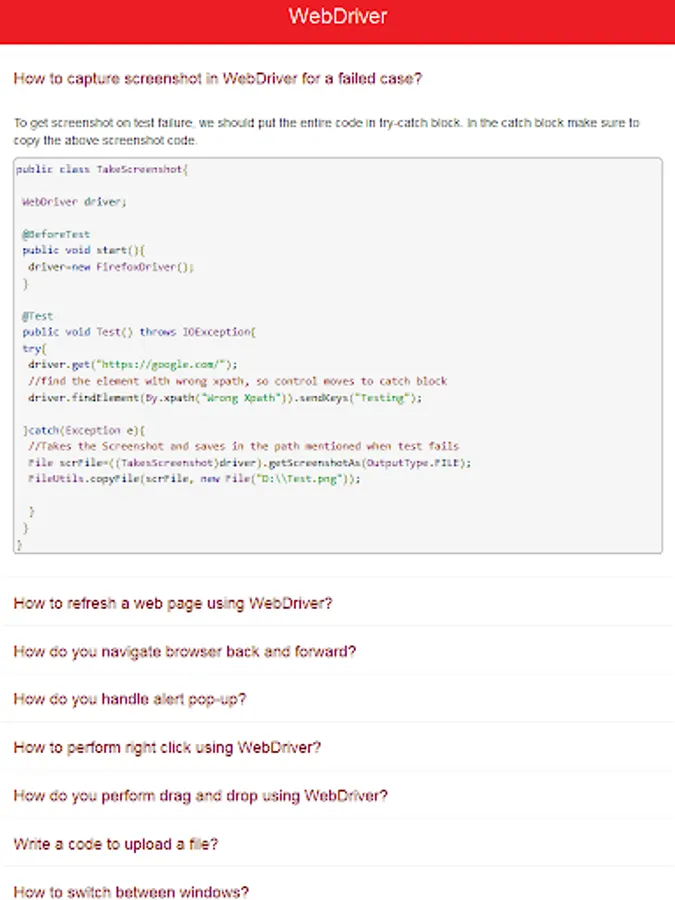 Brings you the collection of WebDriver & Java Interview Questions packed into the app, which are very useful for anyone who wants to prepare for the interview and to learn Selenium. And you can prepare on the go.