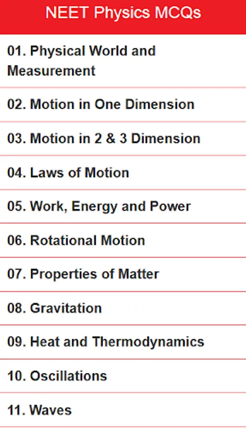 NEET physics MCQs app provides you the collection of chapterwise mcqs with answers, which are very useful for anyone who wants to prepare for the NEET exams and you can prepare on the go!