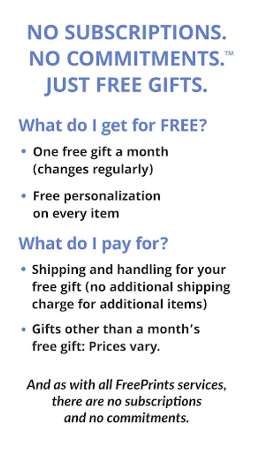 FreePrints Gifts is a member of the growing FreePrints family of mobile apps, each dedicated to designing personalized products quickly, easily and affordably. The popular original FreePrints app lets you order 1,000 free 4x6 photo prints each year, paying only for shipping. And now FreePrints Gifts takes the cost out of sending personalized gifts by giving you a FREE one each and every month. You pay only for shipping.