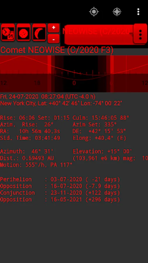 Since version 3.0 Planetdroid comes with a visibility diagram. You see the elevation above the horizon of your selected body (white line) of the current nicht and the elevation of the sun (dark yellow line), as well as the twilight times. The horizontal black line ist the horizon, the vertical red line your selected time.