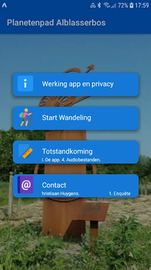 The planet walk was initiated by the Christiaan Huygens weather and astronomy association and was designed, prepared and realized in 2014 by Arno Hol and Frans Rodenburg (both members of the association). The official opening took place on 14 June 2014 by the well-known science journalist Govert Schilling.