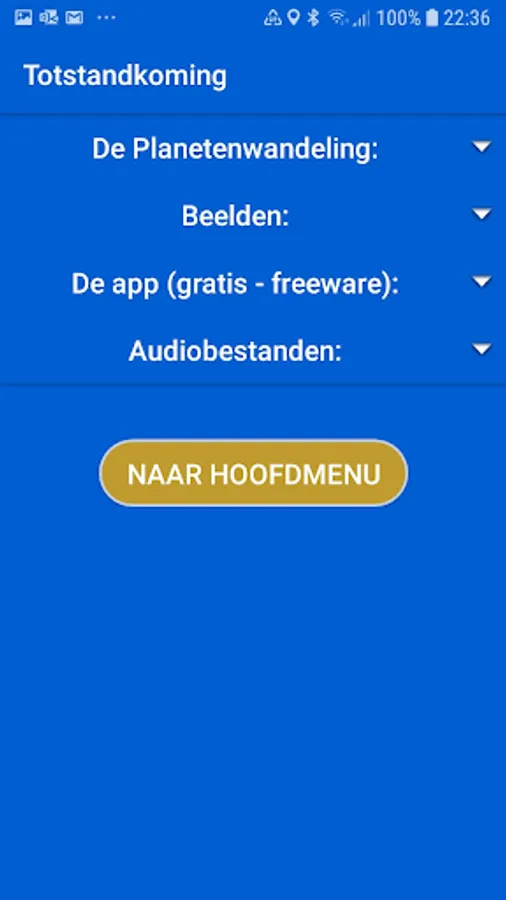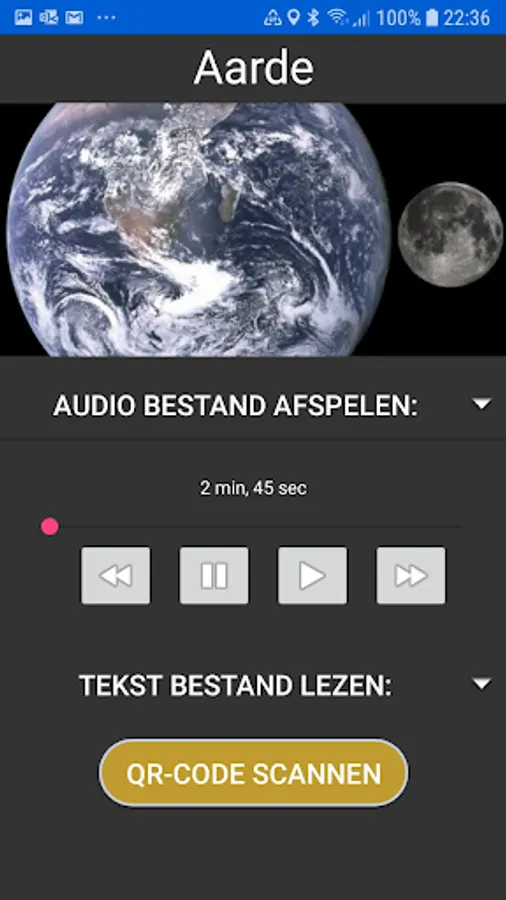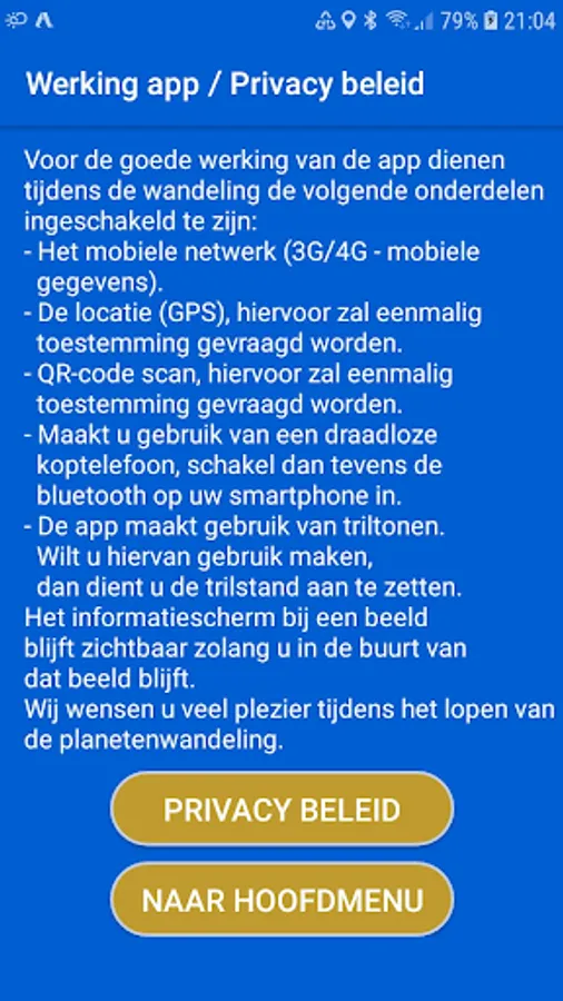 The app functions via Google Maps with GPS and will automatically activate the vibration function when opening an image and open a screen with information. After this, an audio file will also start automatically. It is possible to stop this audio file to make another choice, such as reading the text of the audio file yourself or scanning the QR code at the image. This is done by pressing the triangle behind the option, which opens the screen with extra functions and information.