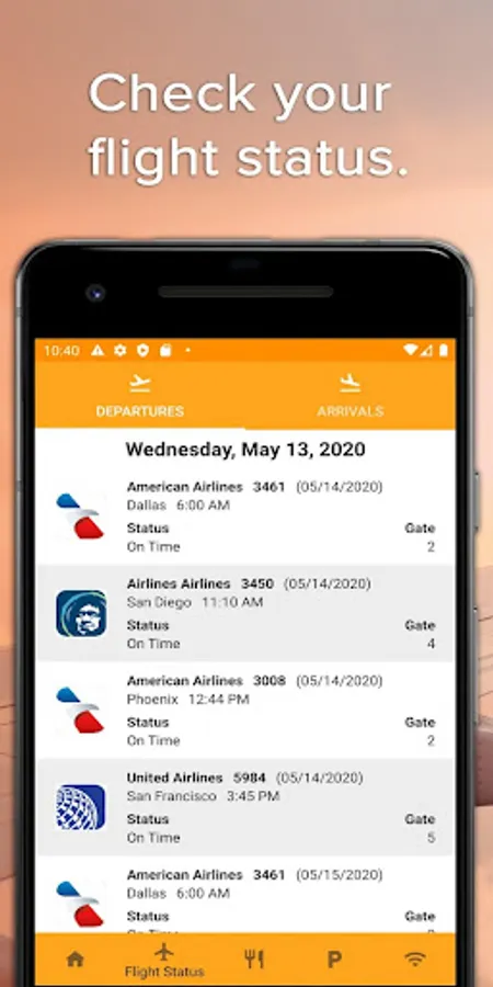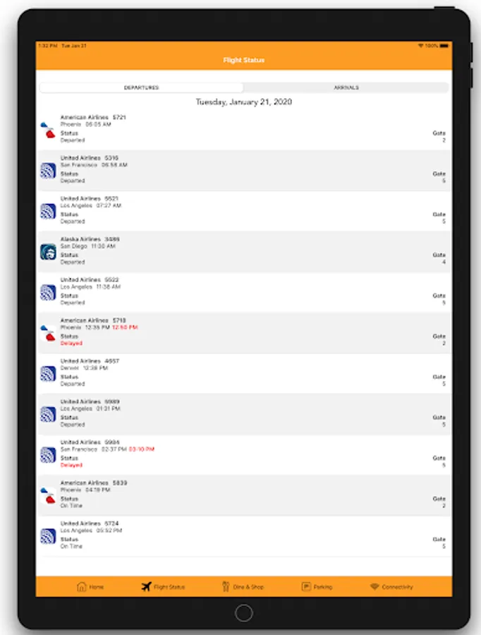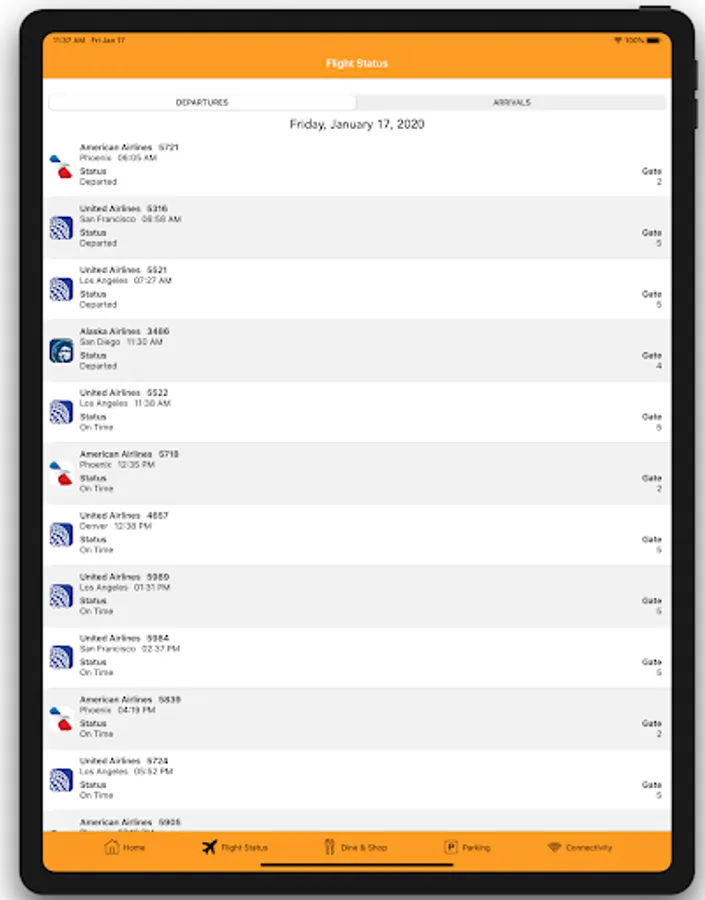 - Detailed flight information (flight number, destination, gate, baggage claim, time, and flight status).