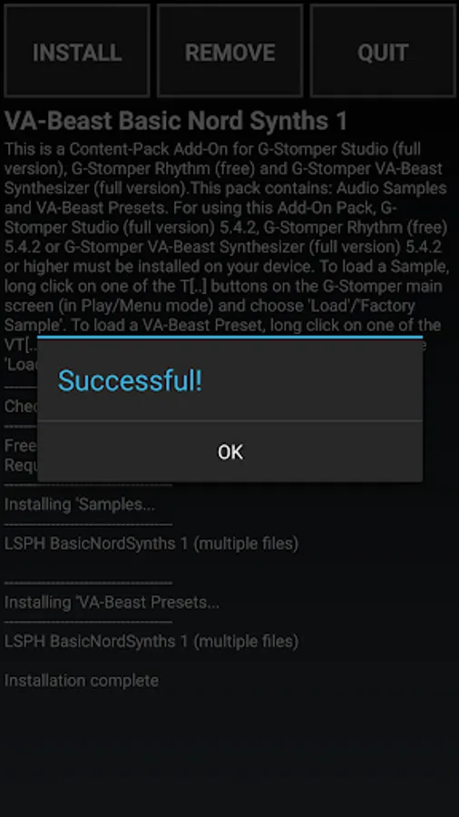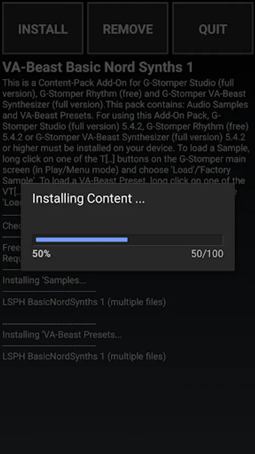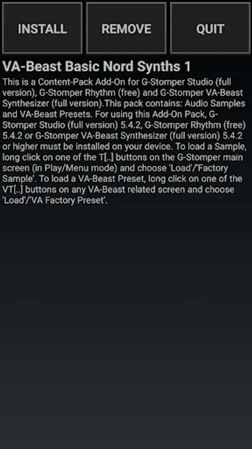 For using this Content-Pack, G-Stomper Studio (full version) or G-Stomper VA-Beast Synthesizer (full version) must be installed on your device.