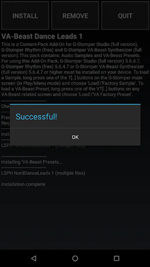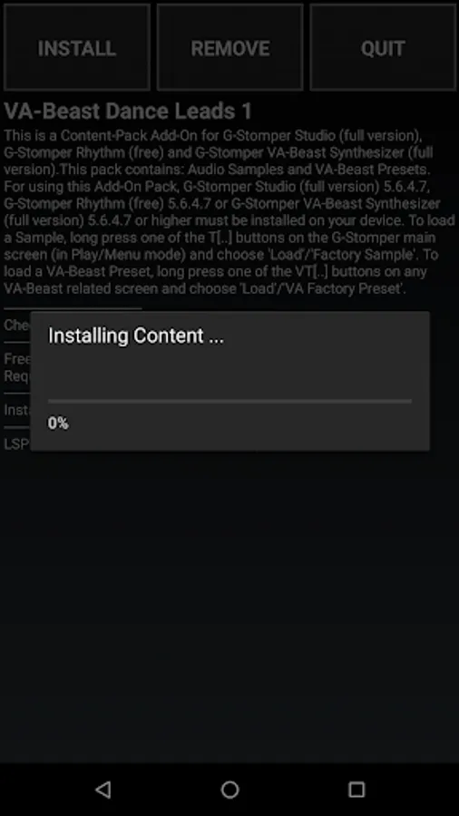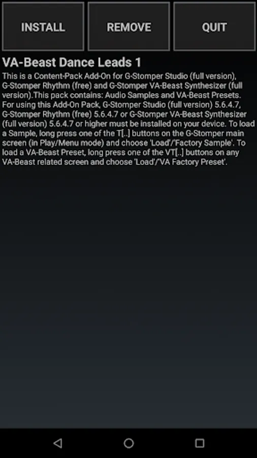 For using this Content-Pack, G-Stomper Studio (full version) or G-Stomper VA-Beast Synthesizer (full version) must be installed on your device.