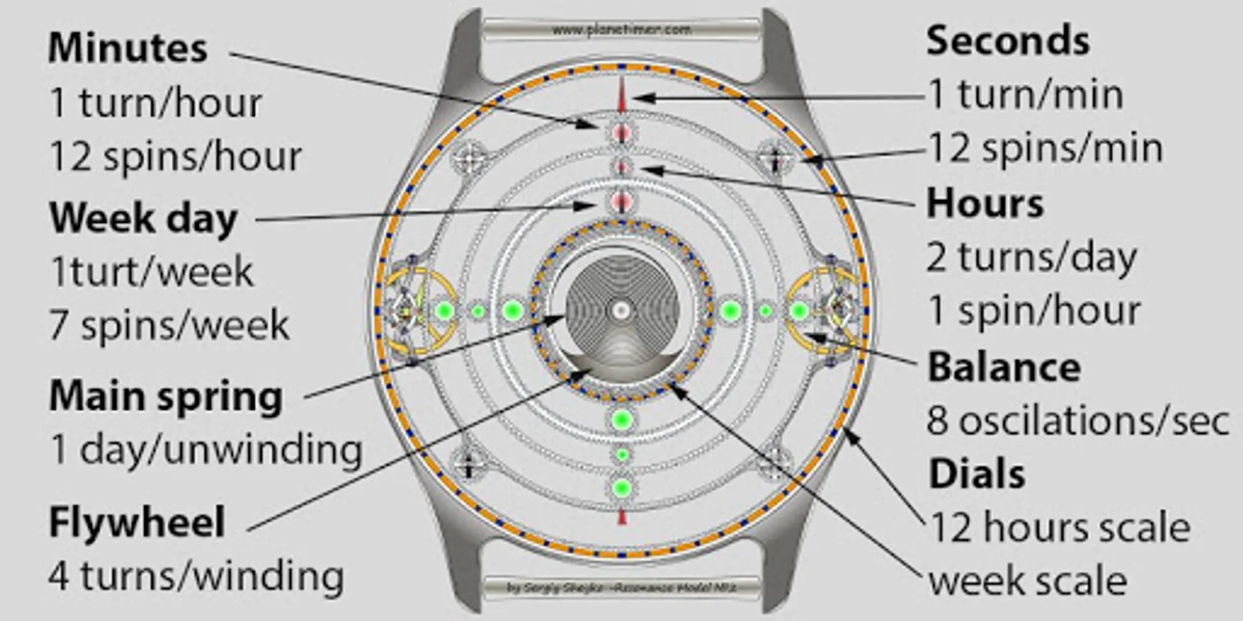 The whole kinematics: gearings, ratchets, springs, balances, winding and anchor escapements moves in correspondence of physics laws. The reverse design with visualization of engagements, oscillations and balance-spring mechanics, as live wallpaper.