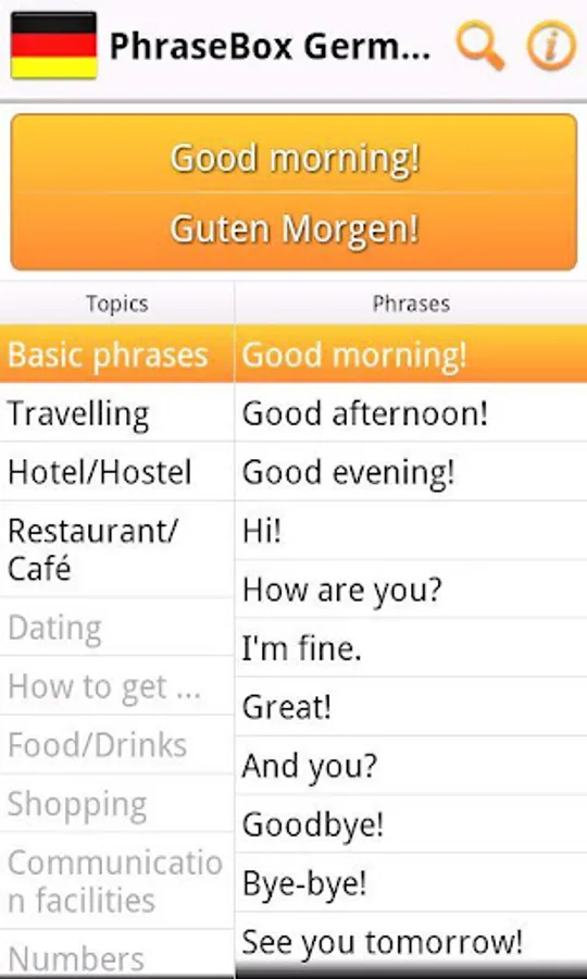 PhraseBox German provides easy orientation in a foreign country, help with travel, communication at restaurants, cafés, hotels, meeting new people, asking for help, great shopping and many other things.