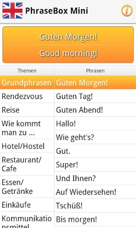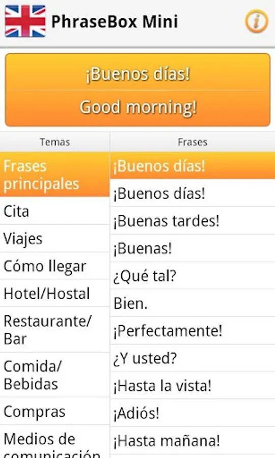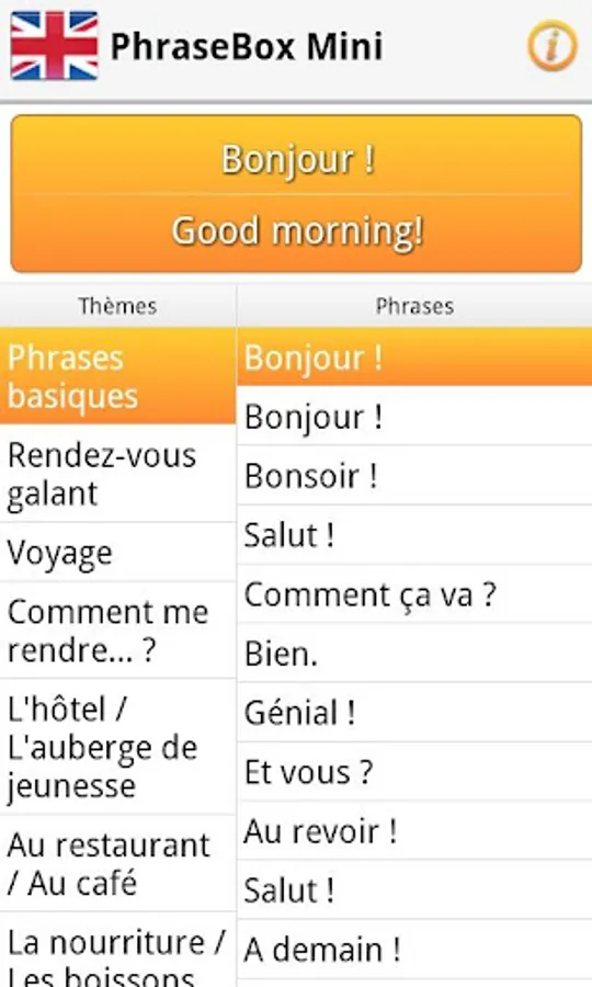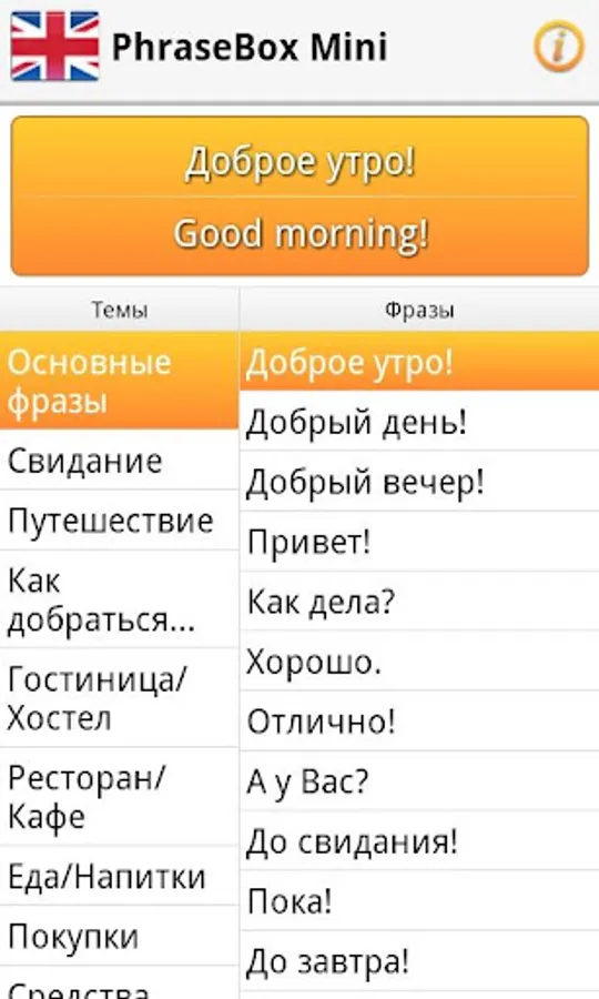 PhraseBox English (GB) provides easy orientation in a foreign country, help with travel, communication at restaurants, cafés, hotels, meeting new people, asking for help, great shopping and many other things.