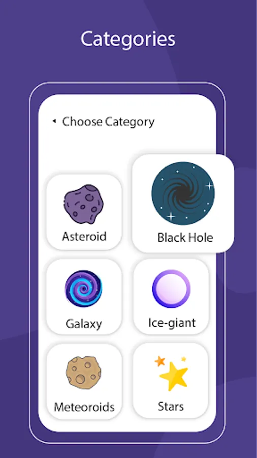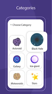 8. It contains categories such as Stars, galaxies, Asteroids, Black holes, Meteoroids, Comets, Jovian Planet, Gas Giants Planets, Ice Giants Planets.
