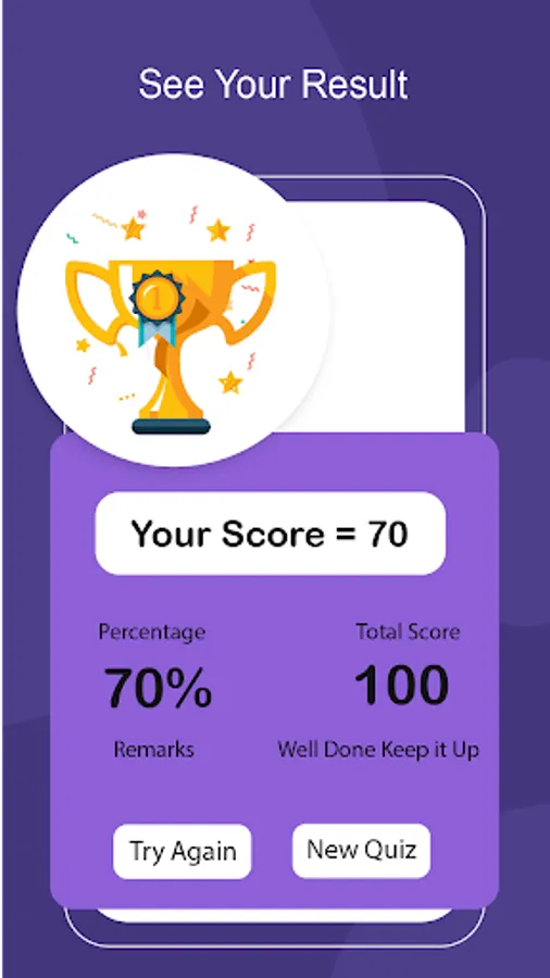 8. When you have done with your quiz a result screen will appear containing your score.