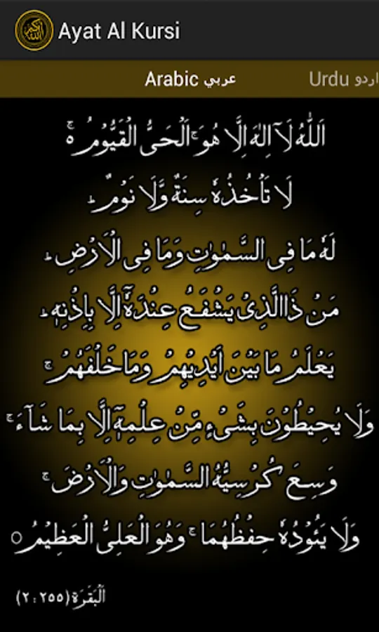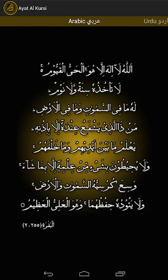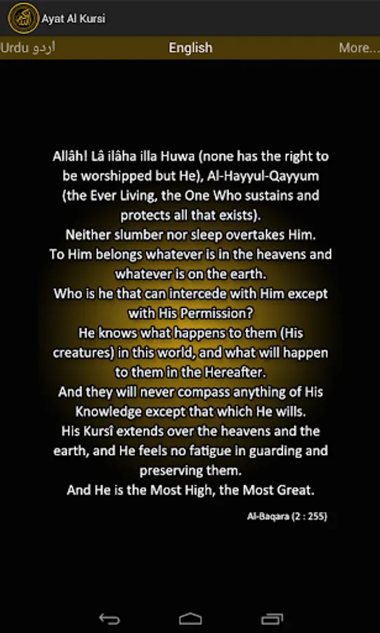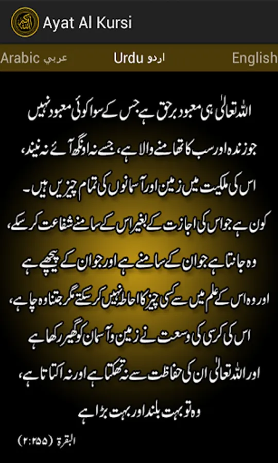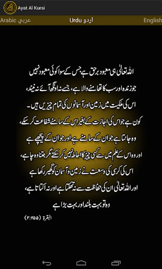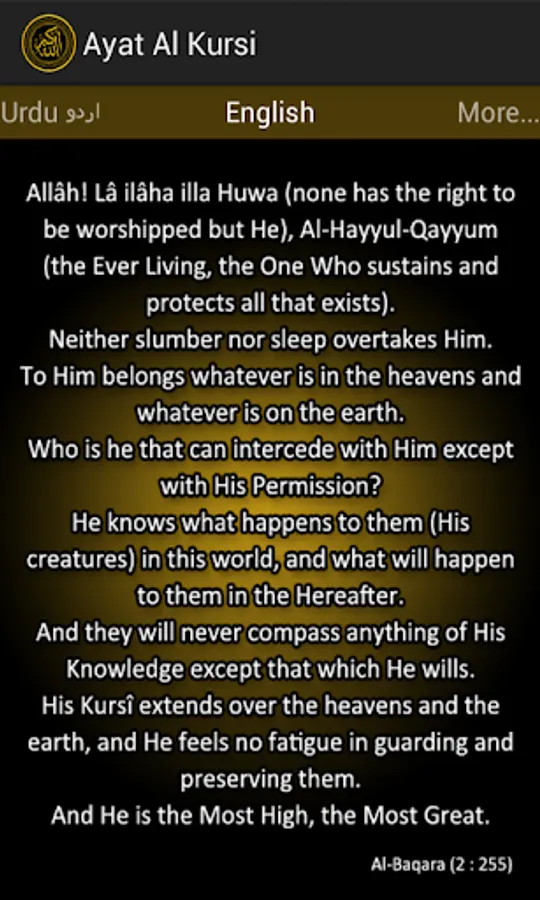 The application contains the most famous verse of the Holy Quran in Arabic and also gives you its Urdu, English, Malay (Indonesian), French, and Spanish (Espanol) translation.