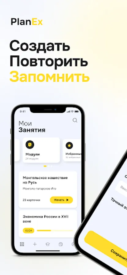 Learning and consolidating your knowledge with PlanEx is very simple: fill out the cards, and then the application will determine for itself when and what information you need to repeat. The smart calendar calculates the time needed to master the material and sends notifications about cards that are ready for repetition.
