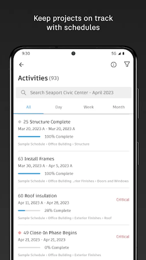 Keep projects on track with a centralized schedule. View the schedule by different timespans or filter by critical items, review dependencies, and assess schedule suggestions.