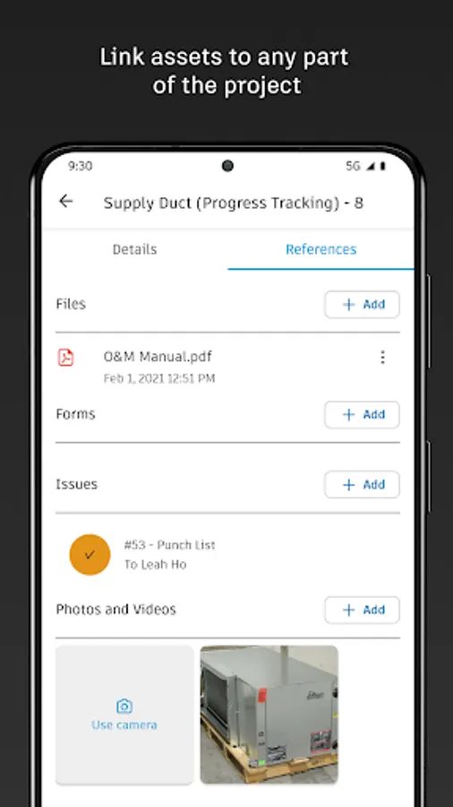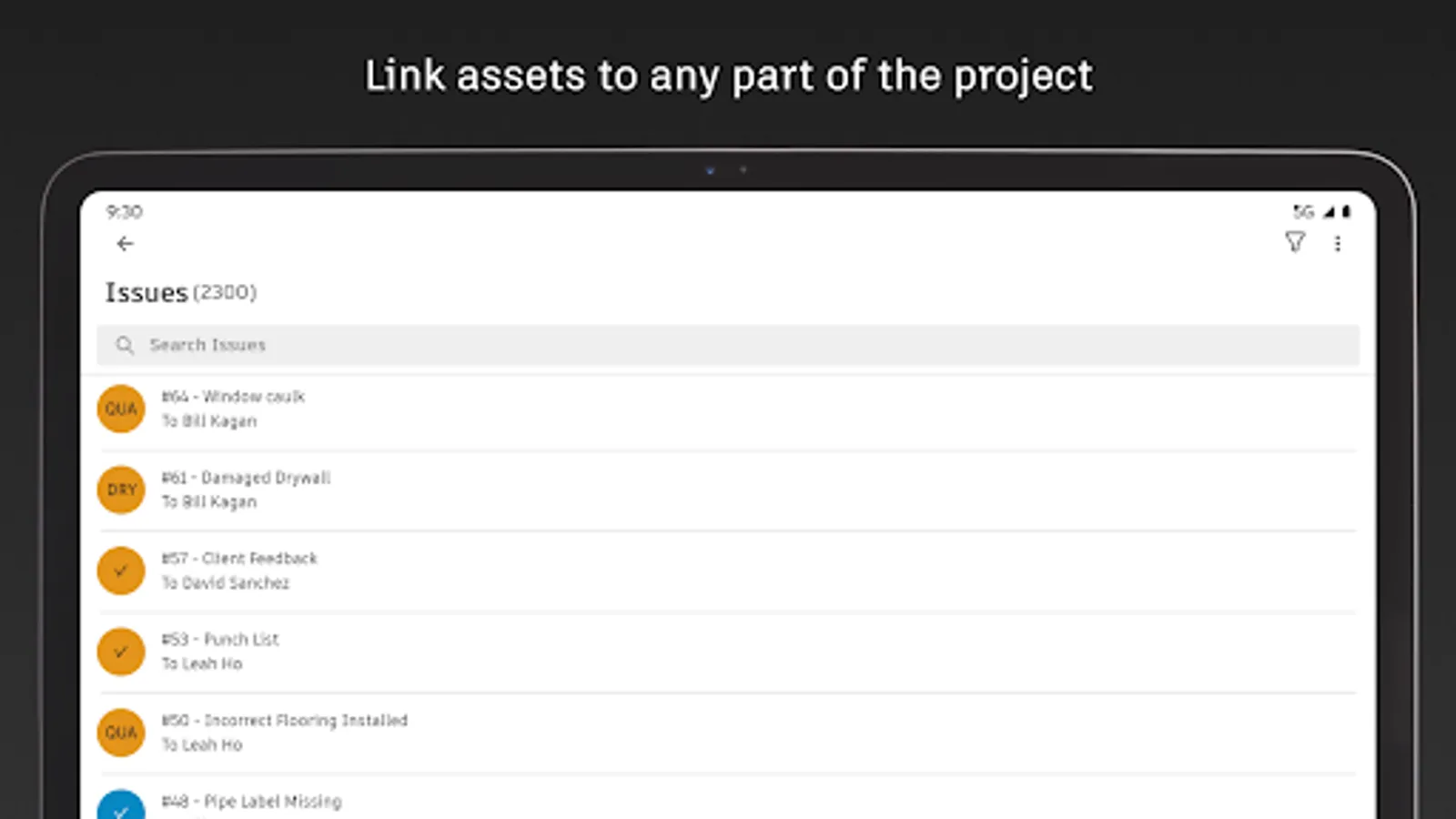 Track issues, from design to handover, all in one place. Resolve issues faster by adding due dates, responsible parties, and easily reference photos, associated files, and RFIs.