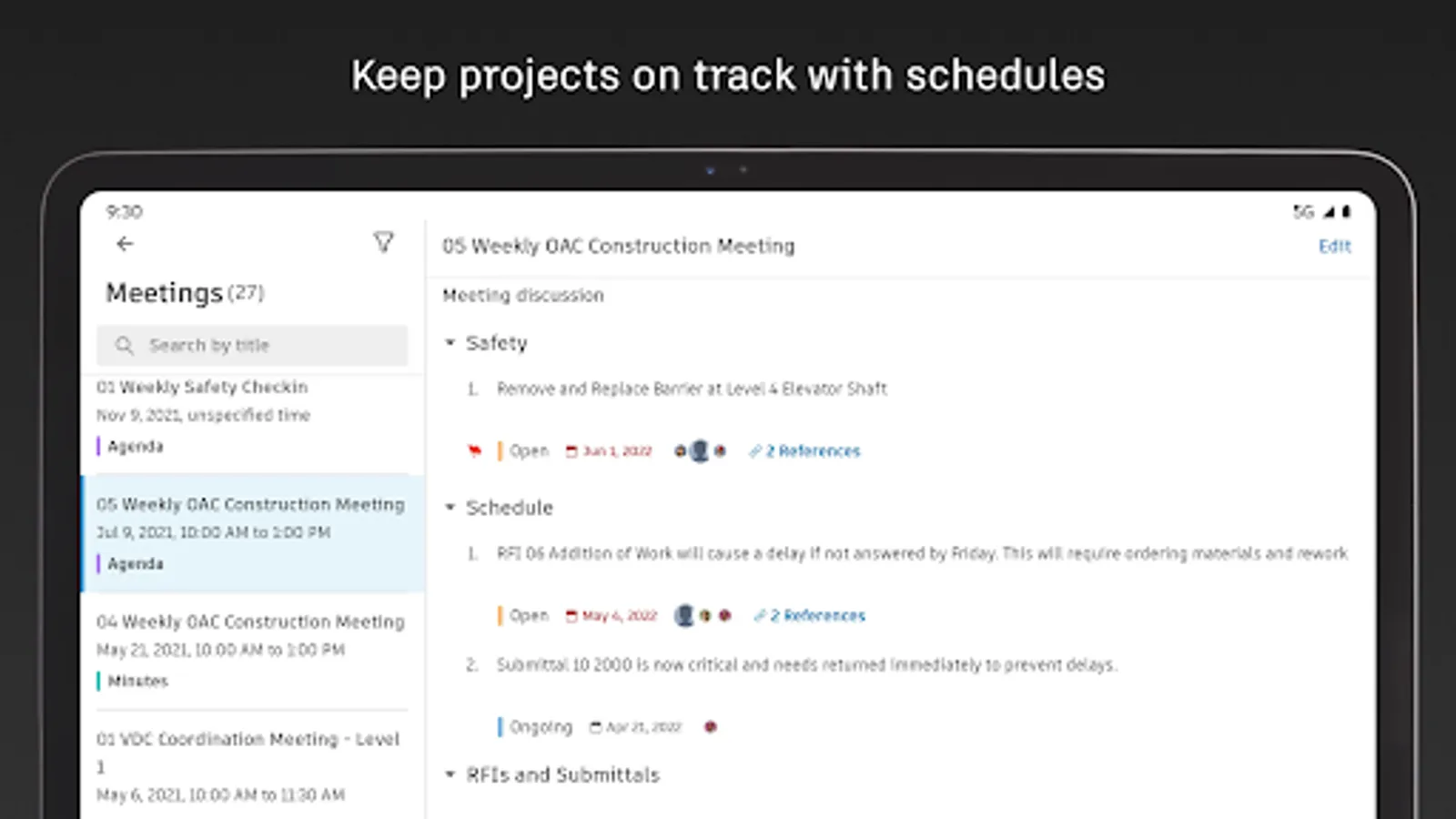Stay ahead of the next meeting by creating meetings and agendas. Link references like issues, models, RFIs or photos. Check on outstanding items and follow up, all from the field.