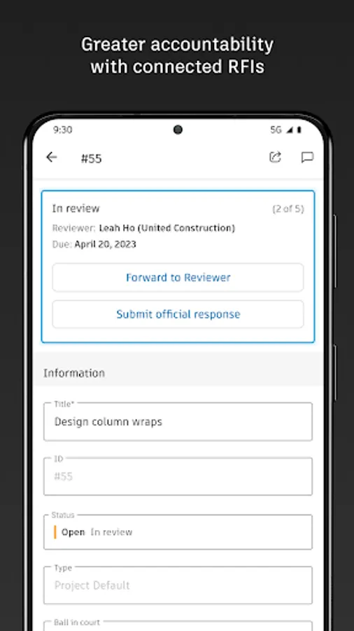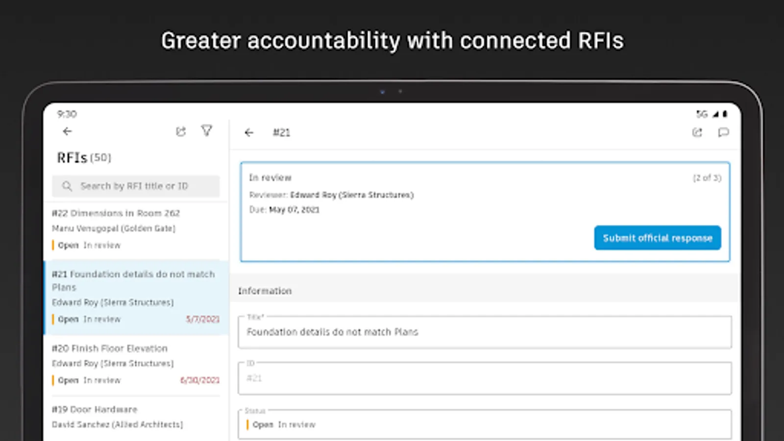 “I’m excited about being able to effortlessly tag a snippet from a drawing onto an RFI and immediately assign responsibilities and track how the project team interacts with a particular issue or RFI. The ability to track an issue’s progression in real-time helps us manage any roadblocks immediately.”