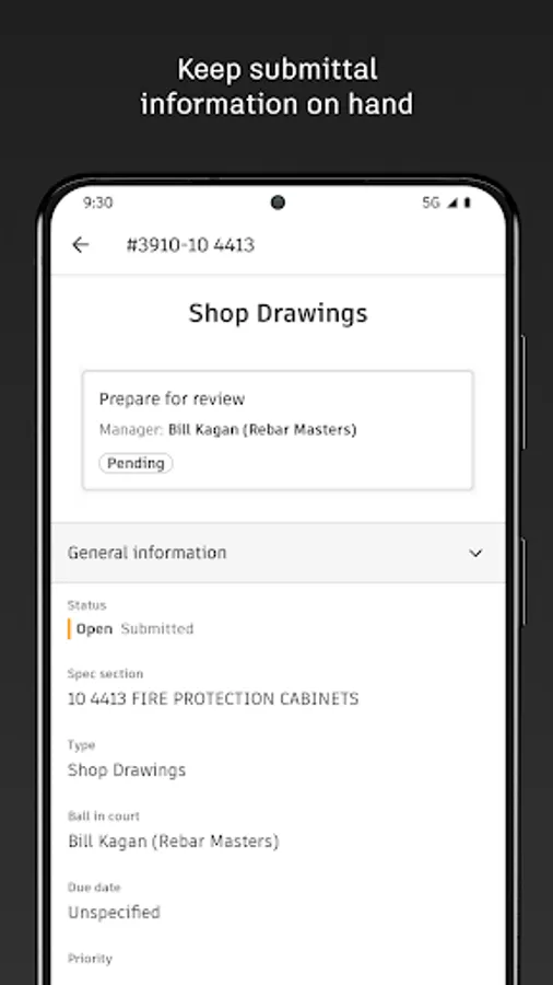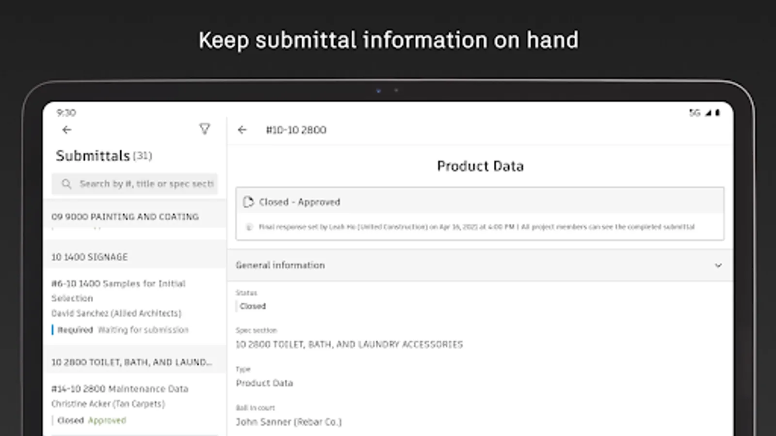 Keep all relevant submittal information on hand. With search, quickly find the necessary submittal to view progress and next steps.