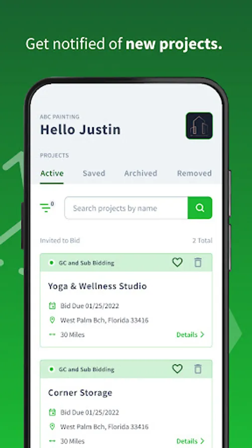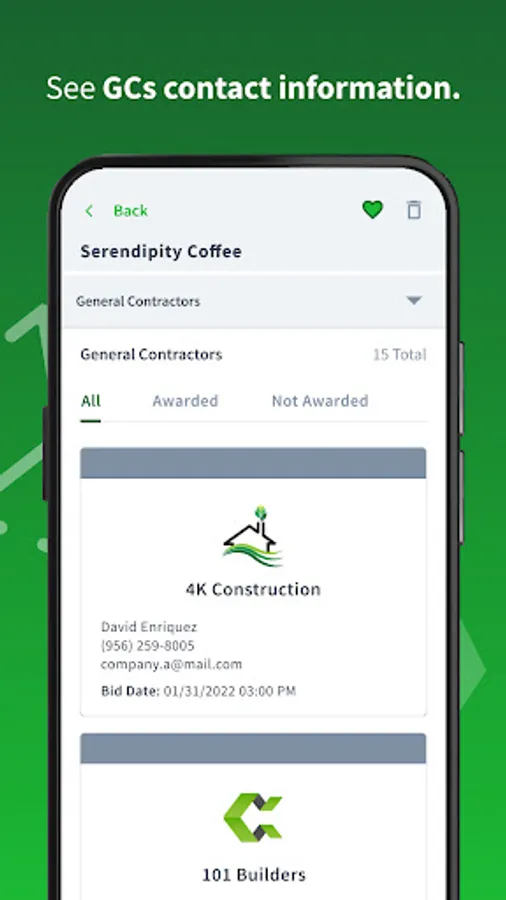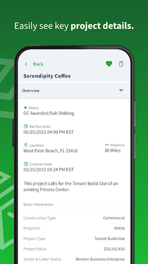 Narrow your search by what matters most and quickly see key project details including which General Contractors are bidding on it.