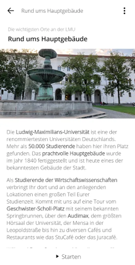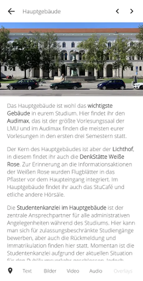 The app contains three routes with several stations: a short university tour to get to know the LMU and two tours through Munich to get to know the city. The stations contain text descriptions that can be heard via audio, as well as images and videos. The university and the city center can be explored either while on the go with the help of GPS or virtually from home.