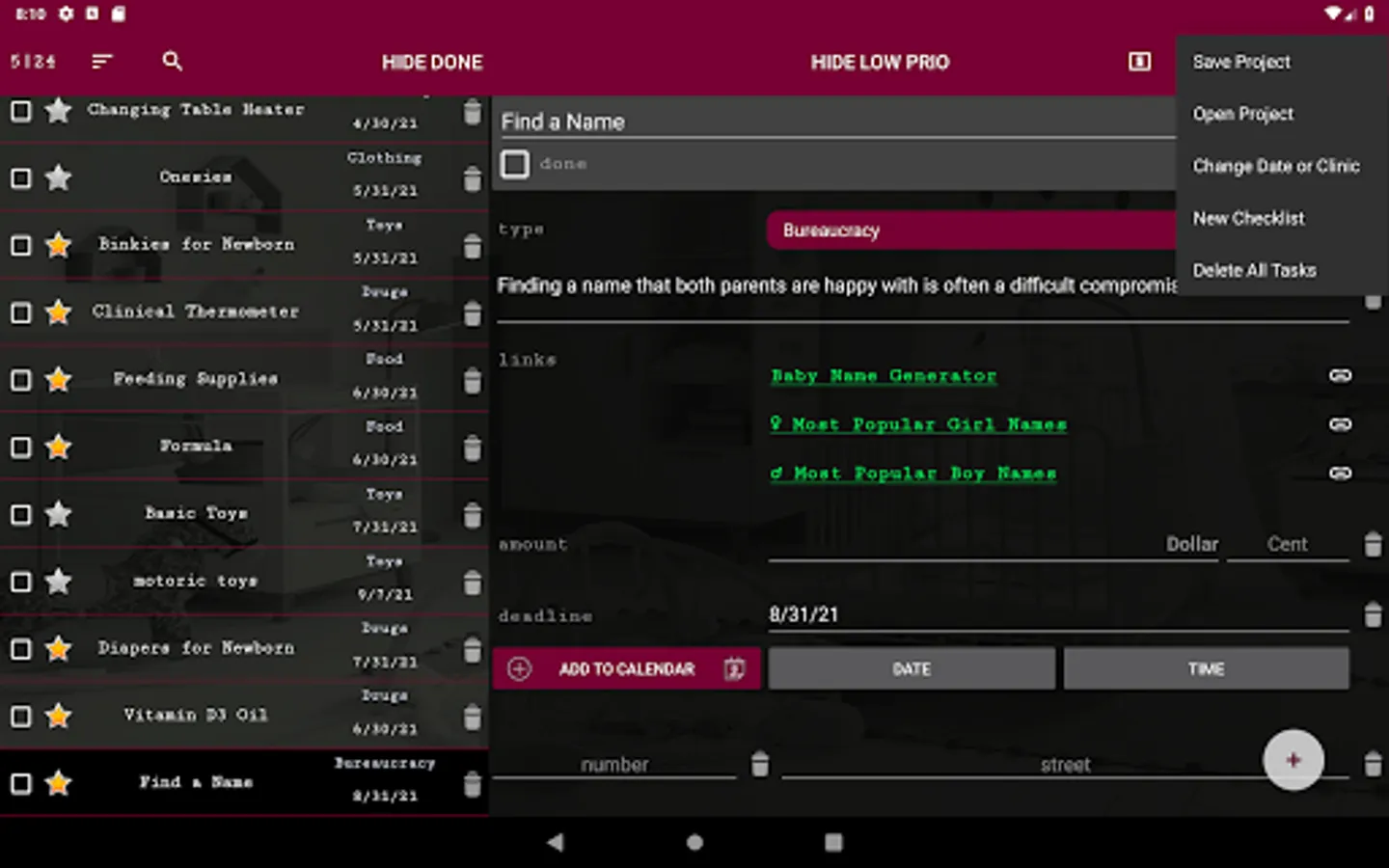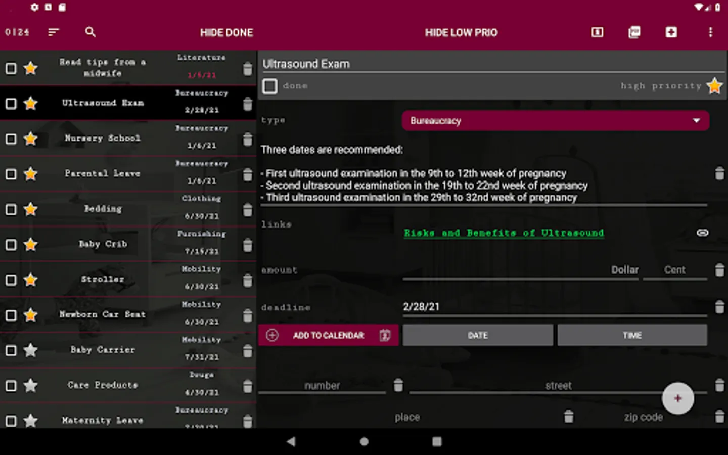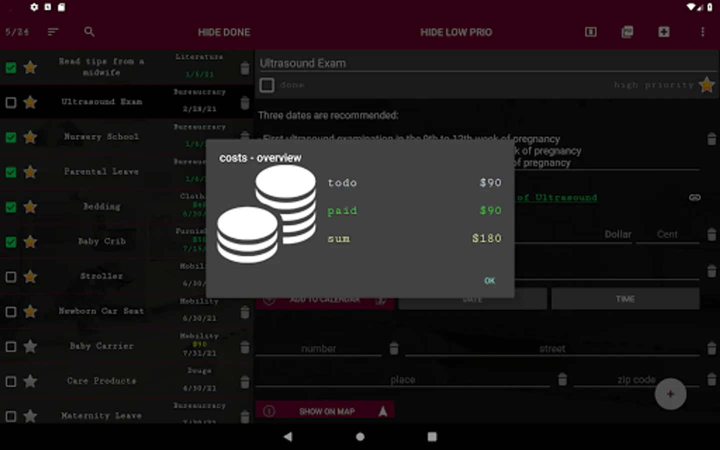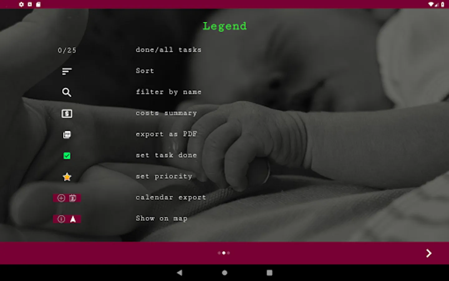 Individualize, categorize and prioritize your checklist. Create new tasks, comment on and export them to your calendar or as pdf. Share tasks with your partner and get notified of upcoming tasks.