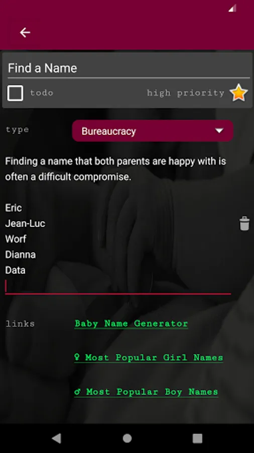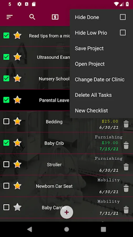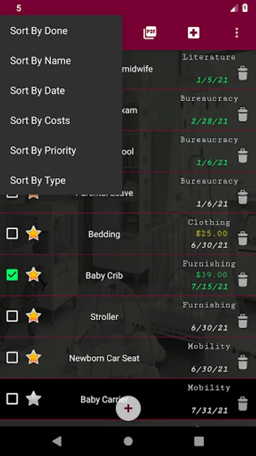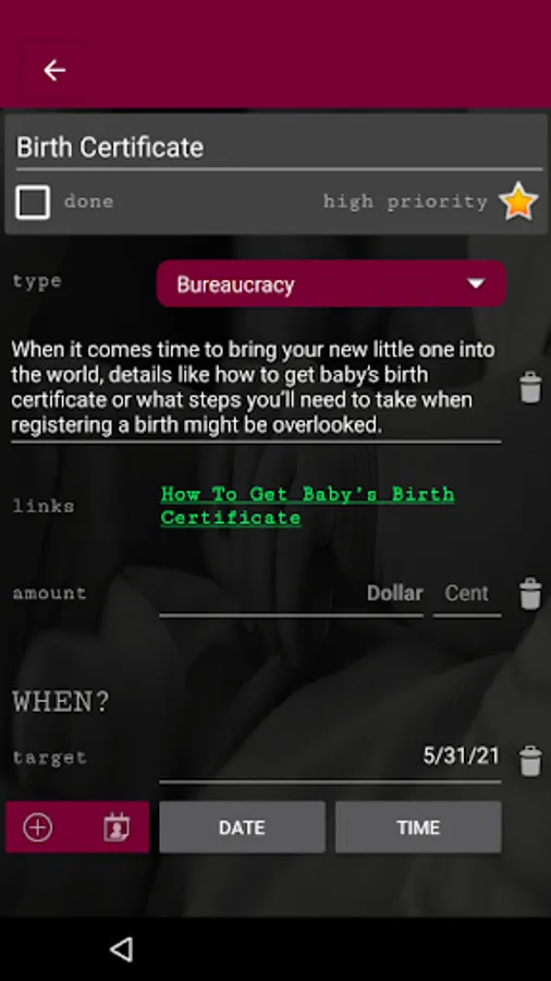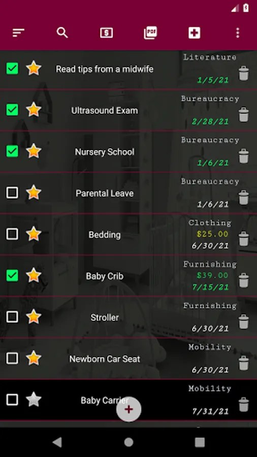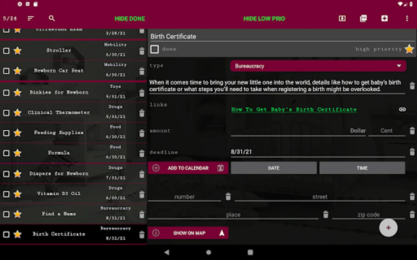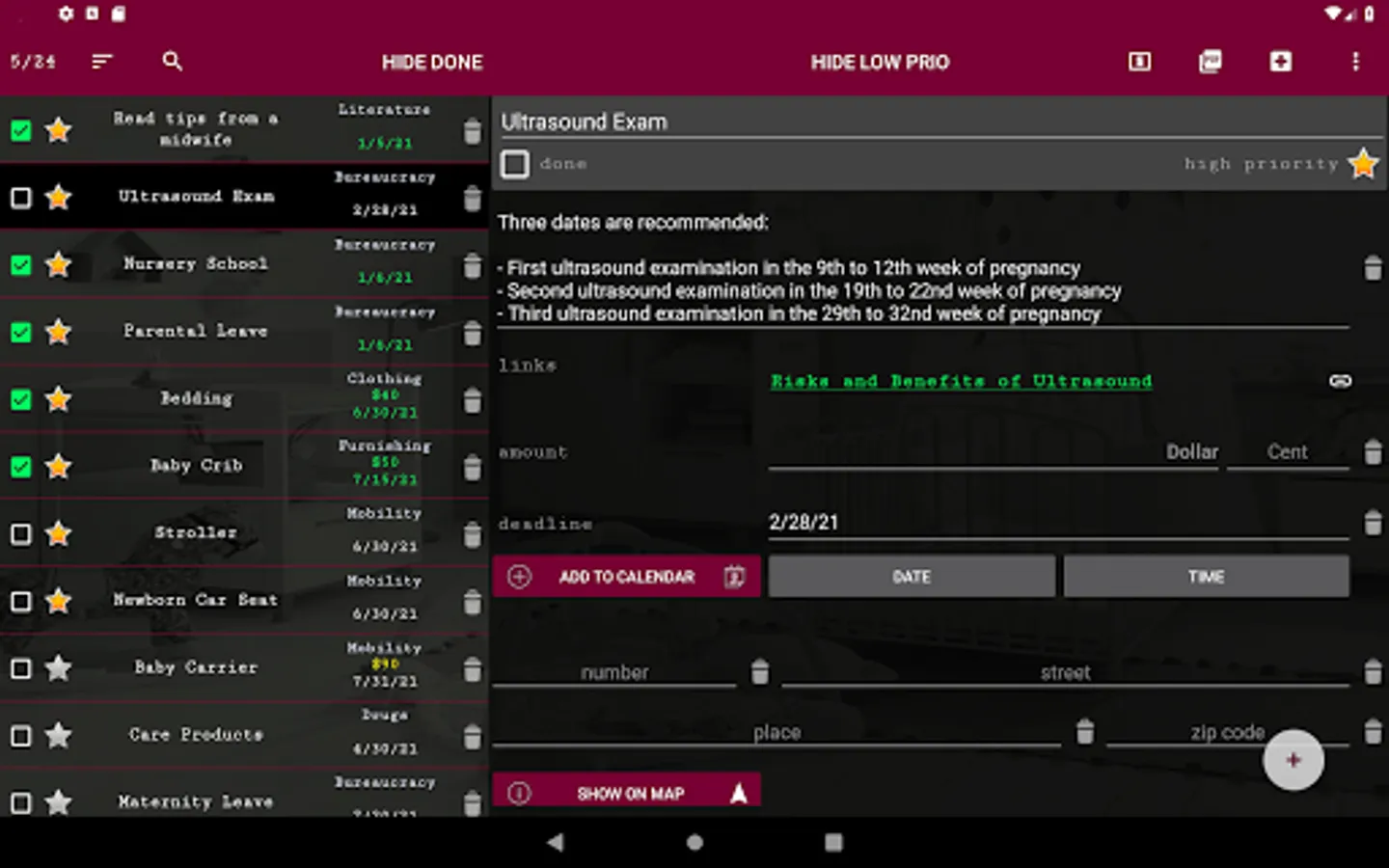 Individualize, categorize and prioritize your checklist. Create new tasks, comment on and export them to your calendar or as pdf. Share tasks with your partner and get notified of upcoming tasks.