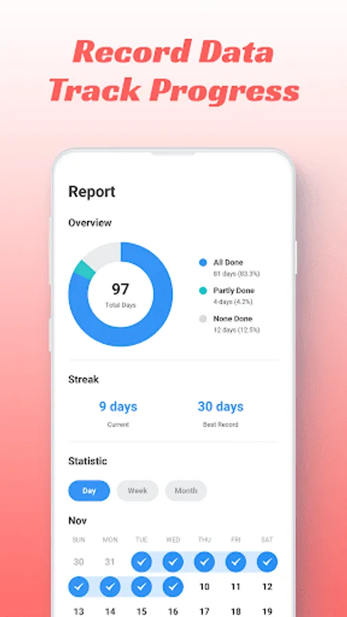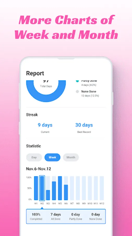 Know your performance in detail and analyze your progress on every habit that you record. Habit Tracker provides many different charts and statistics.